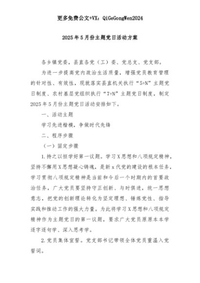 【七哥公文】2025年:2025年5月份主题党日活动方案+更多免费公文+VX:QiGeGongWen2024+更多免费公文+VX:QiGeGongWen2024