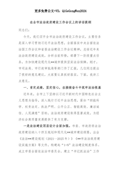 【七哥公文】2025年:在全市法治政府建设工作会议上的讲话提纲+更多免费公文+VX:QiGeGongWen2024+更多免费公文+VX:QiGeGongWen2024