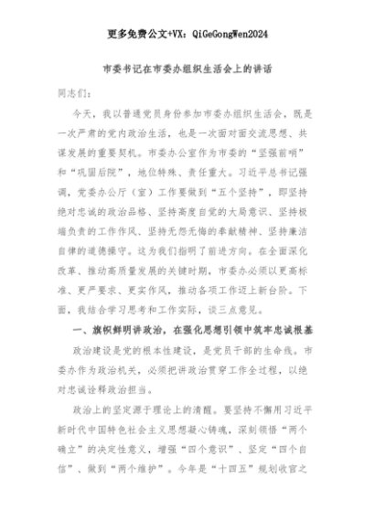 【七哥公文】2025年:市委书记在市委办组织生活会上的讲话+更多免费公文+VX:QiGeGongWen2024+更多免费公文+VX:QiGeGongWen2024