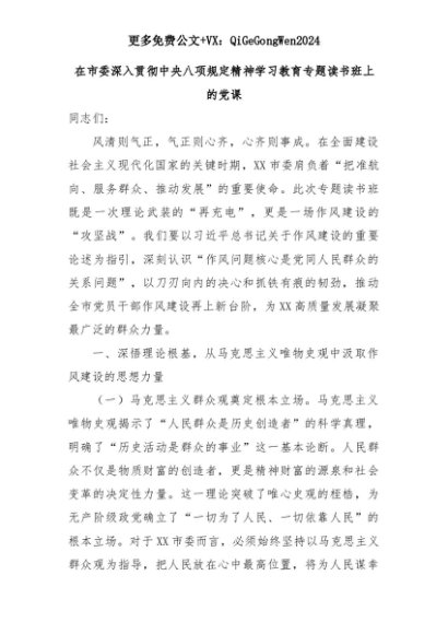 【七哥公文】2025年:在市委深入贯彻中央八项规定精神学习教育专题读书班上的党课+更多免费公文+VX:QiGeGongWen2024+更多免费公文+VX:QiGeGongWen2024