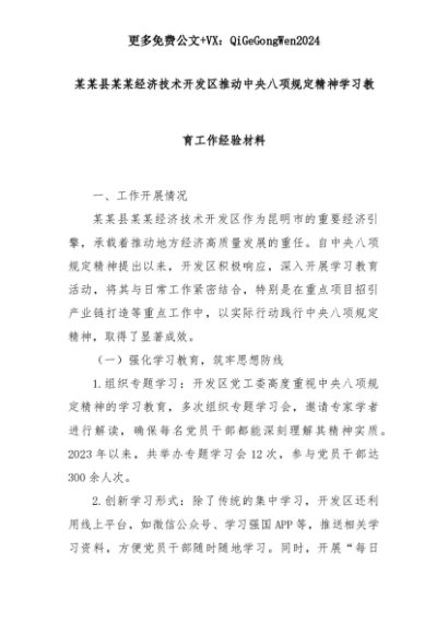 【七哥公文】2025年:某某县某某经济技术开发区推动中央八项规定精神学习教育工作经验材料+更多免费公文+VX:QiGeGongWen2024+更多免费公文+VX:QiGeGongWen2024