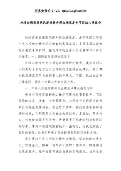 【七哥公文】2025年:持续加强医德医风建设提升群众满意度专项活动心得体会+更多免费公文+VX:QiGeGongWen2024+更多免费公文+VX:QiGeGongWen2024