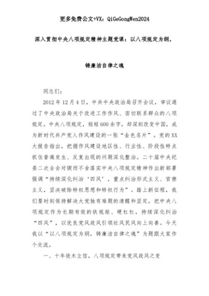 【七哥公文】2025年:深入贯彻中央八项规定精神主题党课:以八项规定为纲,铸廉洁自律之魂+更多免费公文+VX:QiGeGongWen2024+更多免费公文+VX:QiGeGongWen2024