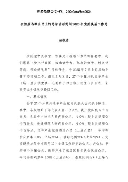【七哥公文】2025年:在换届选举会议上的总结讲话提纲2025年党委换届工作总结报告+更多免费公文+VX:QiGeGongWen2024+更多免费公文+VX:QiGeGongWen2024