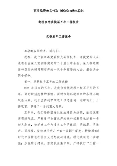 【七哥公文】2025年:电视台党委换届五年工作报告+更多免费公文+VX:QiGeGongWen2024+更多免费公文+VX:QiGeGongWen2024