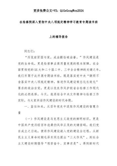 【七哥公文】2025年:在检察院深入贯彻中央八项规定精神学习教育专题读书班上的辅导报告+更多免费公文+VX:QiGeGongWen2024+更多免费公文+VX:QiGeGongWen2024