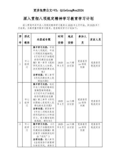 【七哥公文】2025年:深入贯彻中央八项规定精神学习教育学习计划要点(含具体学习章节)+更多免费公文+VX:QiGeGongWen2024+更多免费公文+VX:QiGeGongWen2024