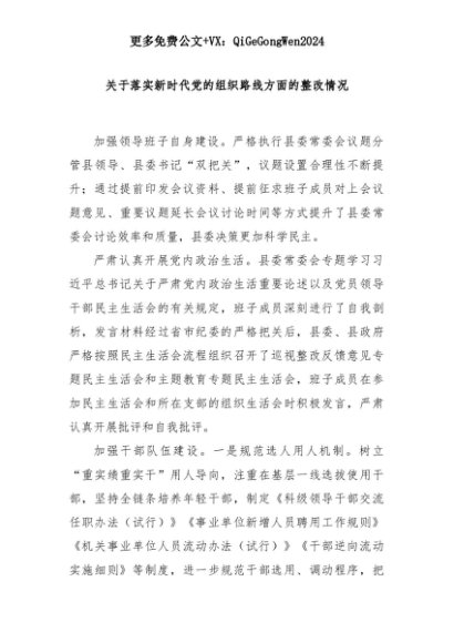 【七哥公文】2025年:关于落实新时代党的组织路线方面的整改情况+更多免费公文+VX:QiGeGongWen2024+更多免费公文+VX:QiGeGongWen2024
