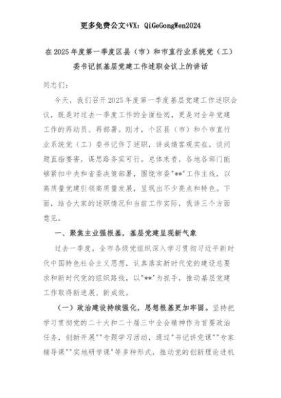 【七哥公文】2025年:在2025年度第一季度区县(市)和市直行业系统党(工)委书记抓基层党建工作述职会议上的讲话+更多免费公文+VX:QiGeGongWen2024+更多免费公文+VX:QiGeGongWen2024