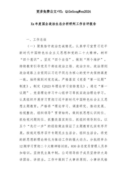 【七哥公文】2025年:Xx年度国企政治生态分析研判工作自评报告+更多免费公文+VX:QiGeGongWen2024+更多免费公文+VX:QiGeGongWen2024