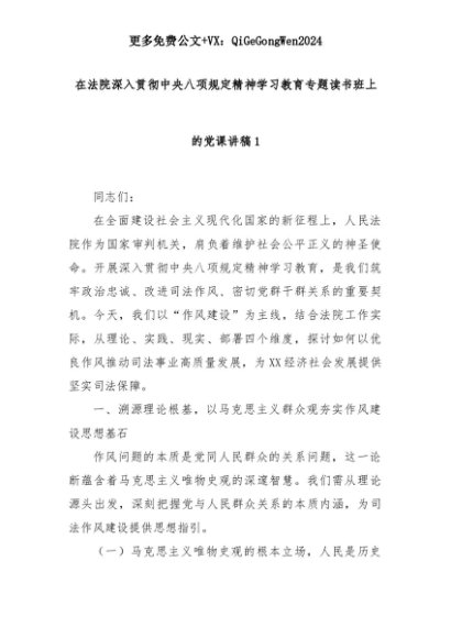 【七哥公文】2025年:在法院深入贯彻中央八项规定精神学习教育专题读书班上的党课讲稿1+更多免费公文+VX:QiGeGongWen2024+更多免费公文+VX:QiGeGongWen2024