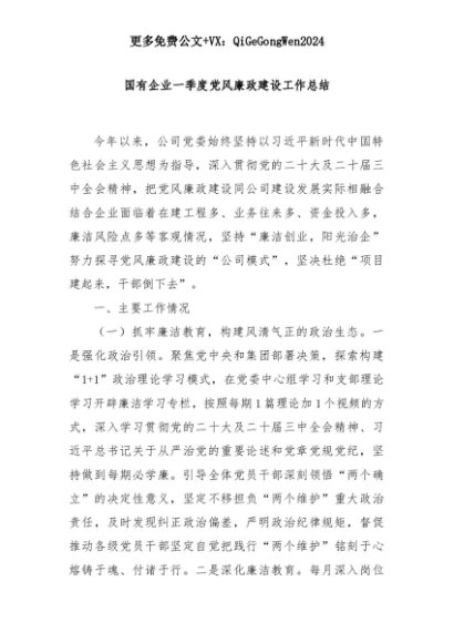 【七哥公文】2025年:国有企业一季度党风廉政建设工作总结+更多免费公文+VX:QiGeGongWen2024+更多免费公文+VX:QiGeGongWen2024