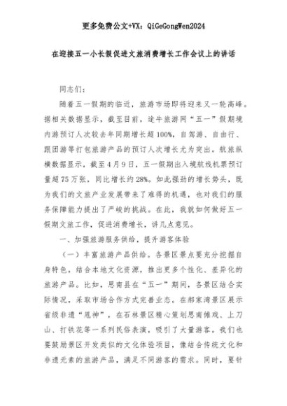 【七哥公文】2025年:在迎接五一小长假促进文旅消费增长工作会议上的讲话+更多免费公文+VX:QiGeGongWen2024+更多免费公文+VX:QiGeGongWen2024