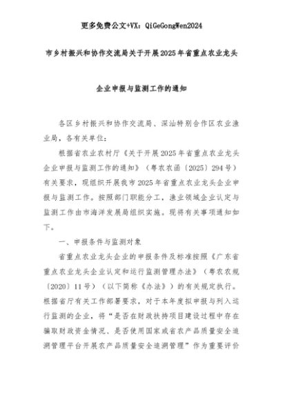 【七哥公文】2025年:市乡村振兴和协作交流局关于开展2025年省重点农业龙头企业申报与监测工作的通知+更多免费公文+VX:QiGeGongWen2024+更多免费公文+VX:QiGeGongWen2024