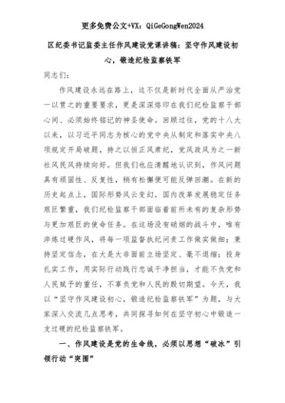 【七哥公文】2025年:区纪委书记监委主任作风建设党课讲稿:坚守作风建设初心,锻造纪检监察铁军+更多免费公文+VX:QiGeGongWen2024+更多免费公文+VX:QiGeGongWen2024