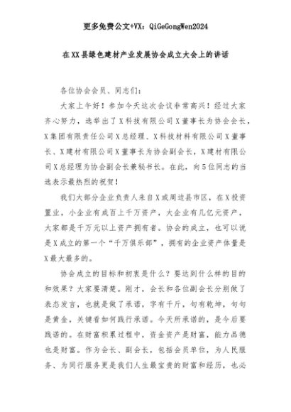 【七哥公文】2025年:在XX县绿色建材产业发展协会成立大会上的讲话+更多免费公文+VX:QiGeGongWen2024+更多免费公文+VX:QiGeGongWen2024