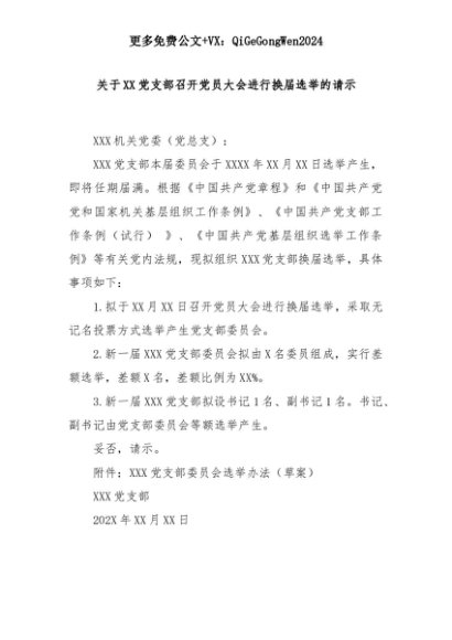 【七哥公文】2025年:关于XX党支部召开党员大会进行换届选举的请示+更多免费公文+VX:QiGeGongWen2024+更多免费公文+VX:QiGeGongWen2024