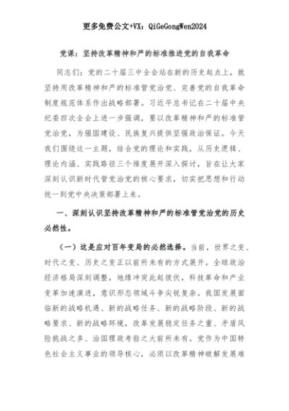 【七哥公文】2025年:党课:坚持改革精神和严的标准推进党的自我革命+更多免费公文+VX:QiGeGongWen2024+更多免费公文+VX:QiGeGongWen2024