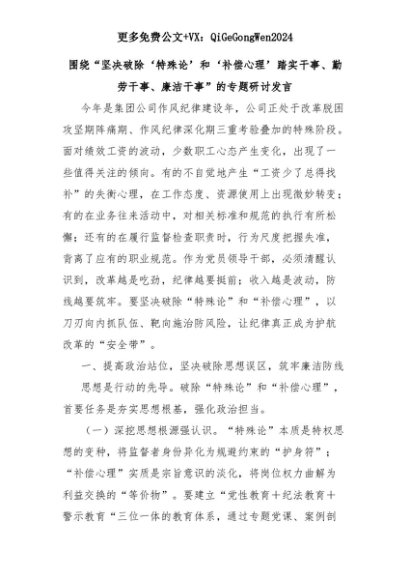【七哥公文】2025年:围绕“坚决破除‘特殊论’和‘补偿心理’踏实干事、勤劳干事、廉洁干事”的专题研讨发言+更多免费公文+VX:QiGeGongWen2024+更多免费公文+VX:QiGeGongWen2024