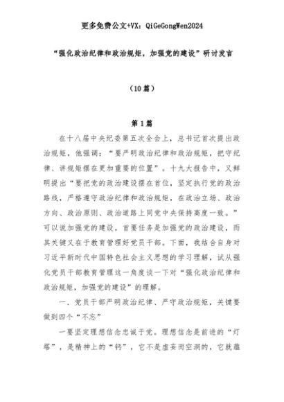 【七哥公文】2025年:(10篇)“强化政治纪律和政治规矩,加强党的建设”研讨发言+更多免费公文+VX:QiGeGongWen2024+更多免费公文+VX:QiGeGongWen2024