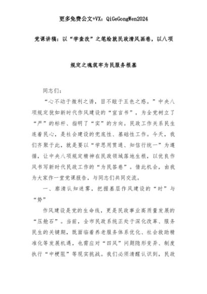 【七哥公文】2025年:党课讲稿:以“学查改”之笔绘就民政清风画卷,以八项规定之魂筑牢为民服务根基+更多免费公文+VX:QiGeGongWen2024+更多免费公文+VX:QiGeGongWen2024