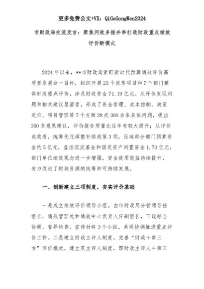 【七哥公文】2025年:市财政局交流发言:聚焦问效多措并举打造财政重点绩效评价新模式+更多免费公文+VX:QiGeGongWen2024+更多免费公文+VX:QiGeGongWen2024