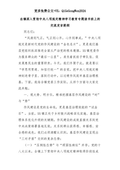 【七哥公文】2025年:在镇深入贯彻中央八项规定精神学习教育专题读书班上的交流发言提纲+更多免费公文+VX:QiGeGongWen2024+更多免费公文+VX:QiGeGongWen2024
