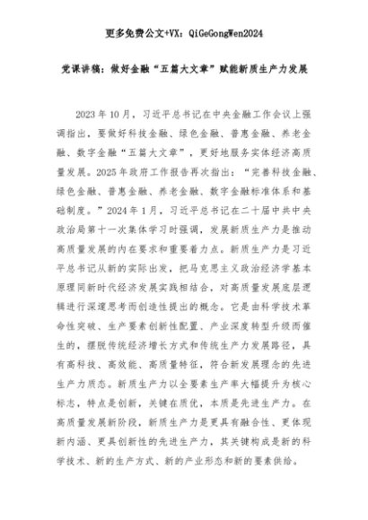 【七哥公文】2025年:党课讲稿:做好金融“五篇大文章”赋能新质生产力发展+更多免费公文+VX:QiGeGongWen2024+更多免费公文+VX:QiGeGongWen2024