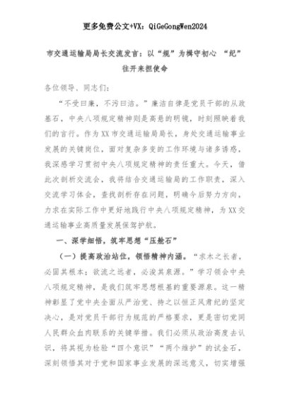 【七哥公文】2025年:市交通运输局局长交流发言:以“规”为楫守初心 “纪”往开来担使命+更多免费公文+VX:QiGeGongWen2024+更多免费公文+VX:QiGeGongWen2024