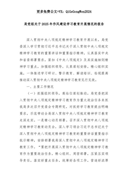【七哥公文】2025年:局党组关于2025年作风建设学习教育开展情况的报告+更多免费公文+VX:QiGeGongWen2024+更多免费公文+VX:QiGeGongWen2024