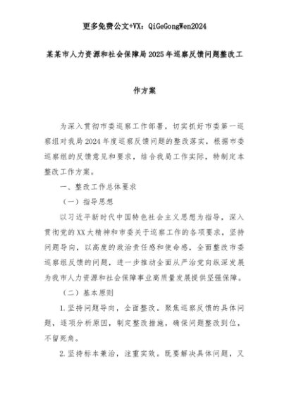 【七哥公文】2025年:某某市人力资源和社会保障局2025年巡察反馈问题整改工作方案+更多免费公文+VX:QiGeGongWen2024+更多免费公文+VX:QiGeGongWen2024
