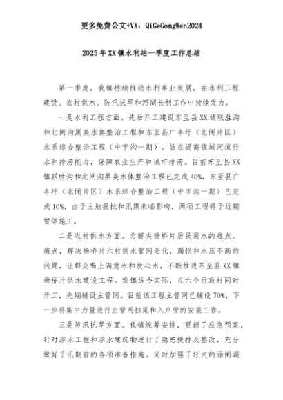 【七哥公文】2025年:2025年XX镇水利站一季度工作总结+更多免费公文+VX:QiGeGongWen2024+更多免费公文+VX:QiGeGongWen2024