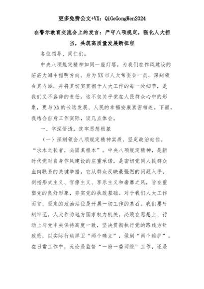 【七哥公文】2025年:在警示教育交流会上的发言:严守八项规定,强化人大担当,共筑高质量发展新征程+更多免费公文+VX:QiGeGongWen2024+更多免费公文+VX:QiGeGongWen2024