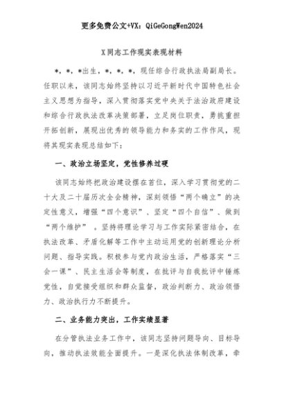 【七哥公文】2025年:X同志工作现实表现材料+更多免费公文+VX:QiGeGongWen2024+更多免费公文+VX:QiGeGongWen2024