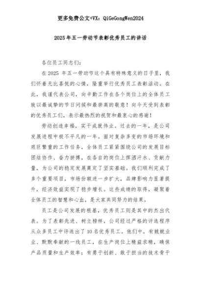 【七哥公文】2025年:2025年五一劳动节表彰优秀员工的讲话+更多免费公文+VX:QiGeGongWen2024+更多免费公文+VX:QiGeGongWen2024