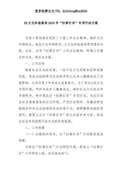 【七哥公文】2025年:XX文化和旅游局2025年“扫黄打非”专项行动方案+更多免费公文+VX:QiGeGongWen2024+更多免费公文+VX:QiGeGongWen2024