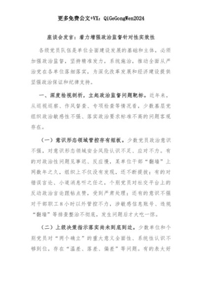 【七哥公文】2025年:座谈会发言:着力增强政治监督针对性实效性+更多免费公文+VX:QiGeGongWen2024+更多免费公文+VX:QiGeGongWen2024