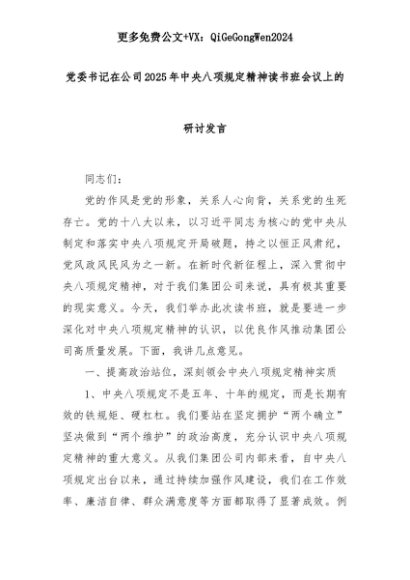 【七哥公文】2025年:党委书记在公司2025年中央八项规定精神读书班会议上的研讨发言+更多免费公文+VX:QiGeGongWen2024+更多免费公文+VX:QiGeGongWen2024