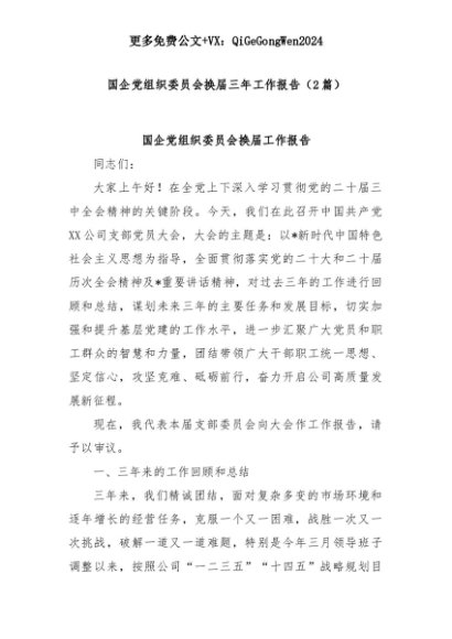 【七哥公文】2025年:(2篇)国企党组织委员会换届三年工作报告+更多免费公文+VX:QiGeGongWen2024+更多免费公文+VX:QiGeGongWen2024