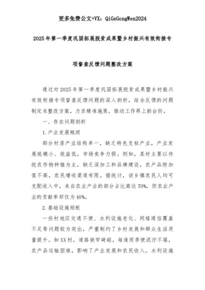 【七哥公文】2025年:2025年第一季度巩固拓展脱贫成果暨乡村振兴有效衔接专项督查反馈问题整改方案+更多免费公文+VX:QiGeGongWen2024+更多免费公文+VX:QiGeGongWen2024