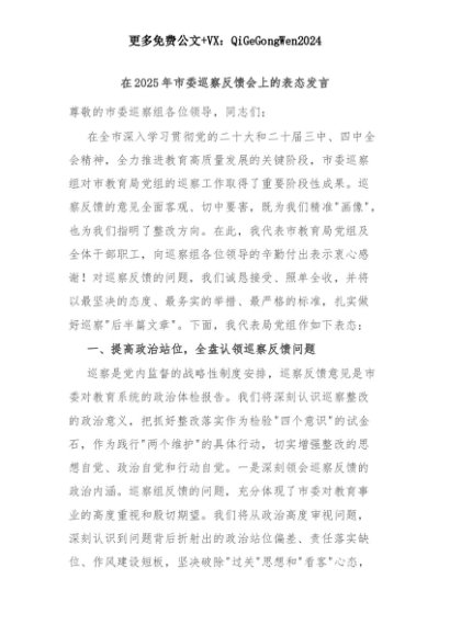 【七哥公文】2025年:在2025年市委巡察反馈会上的表态发言+更多免费公文+VX:QiGeGongWen2024+更多免费公文+VX:QiGeGongWen2024