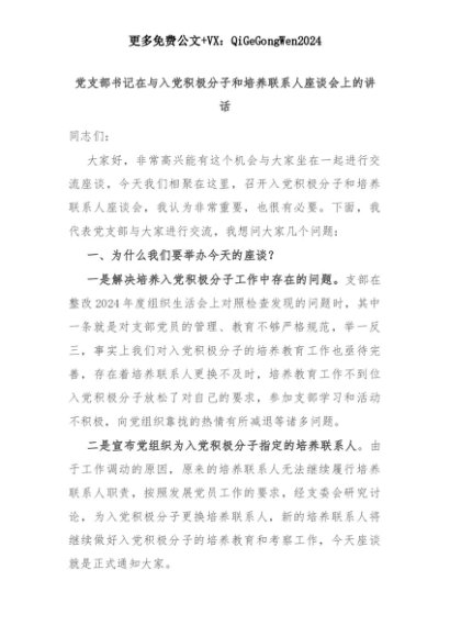 【七哥公文】2025年:党支部书记在与入党积极分子和培养联系人座谈会上的讲话+更多免费公文+VX:QiGeGongWen2024+更多免费公文+VX:QiGeGongWen2024