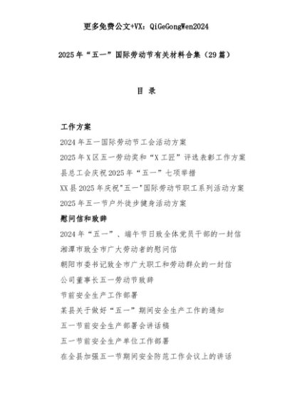 【七哥公文】2025年:(29篇)2025年“五一”国际劳动节有关材料合集+更多免费公文+VX:QiGeGongWen2024+更多免费公文+VX:QiGeGongWen2024