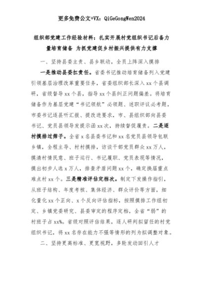 【七哥公文】2025年:组织部党建工作经验材料:扎实开展村党组织书记后备力量培育储备 为抓党建促乡村振兴提供有力支撑+更多免费公文+VX:QiGeGongWen2024+更多免费公文+VX:QiGeGongWen2024