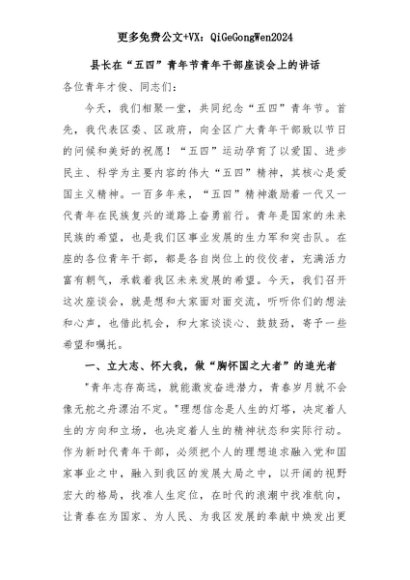 【七哥公文】2025年:县长在“五四”青年节青年干部座谈会上的讲话+更多免费公文+VX:QiGeGongWen2024+更多免费公文+VX:QiGeGongWen2024