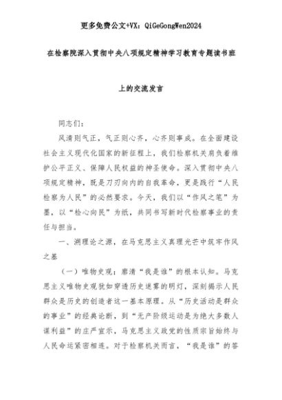 【七哥公文】2025年:在检察院深入贯彻中央八项规定精神学习教育专题读书班上的交流发言+更多免费公文+VX:QiGeGongWen2024+更多免费公文+VX:QiGeGongWen2024