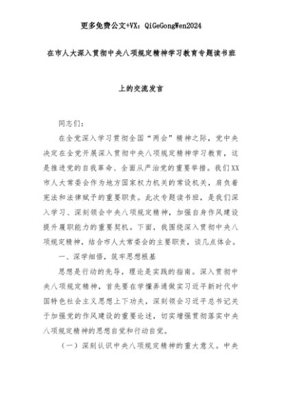 【七哥公文】2025年:在市人大深入贯彻中央八项规定精神学习教育专题读书班上的交流发言+更多免费公文+VX:QiGeGongWen2024+更多免费公文+VX:QiGeGongWen2024
