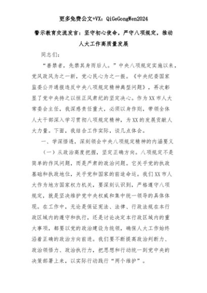 【七哥公文】2025年:警示教育交流发言:坚守初心使命,严守八项规定,推动人大工作高质量发展+更多免费公文+VX:QiGeGongWen2024+更多免费公文+VX:QiGeGongWen2024