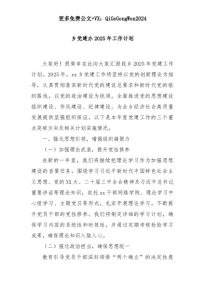【七哥公文】2025年:乡党建办2025年工作计划+更多免费公文+VX:QiGeGongWen2024+更多免费公文+VX:QiGeGongWen2024
