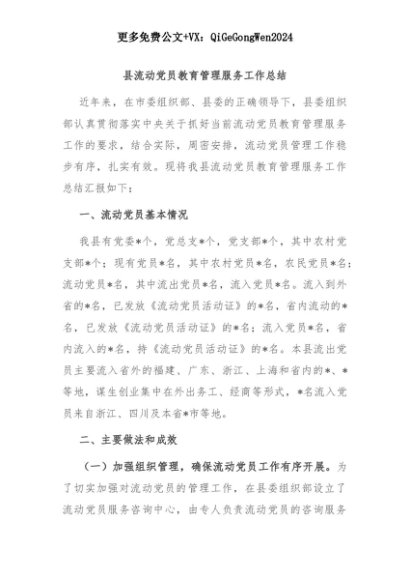 【七哥公文】2025年:县流动党员教育管理服务工作总结+更多免费公文+VX:QiGeGongWen2024+更多免费公文+VX:QiGeGongWen2024